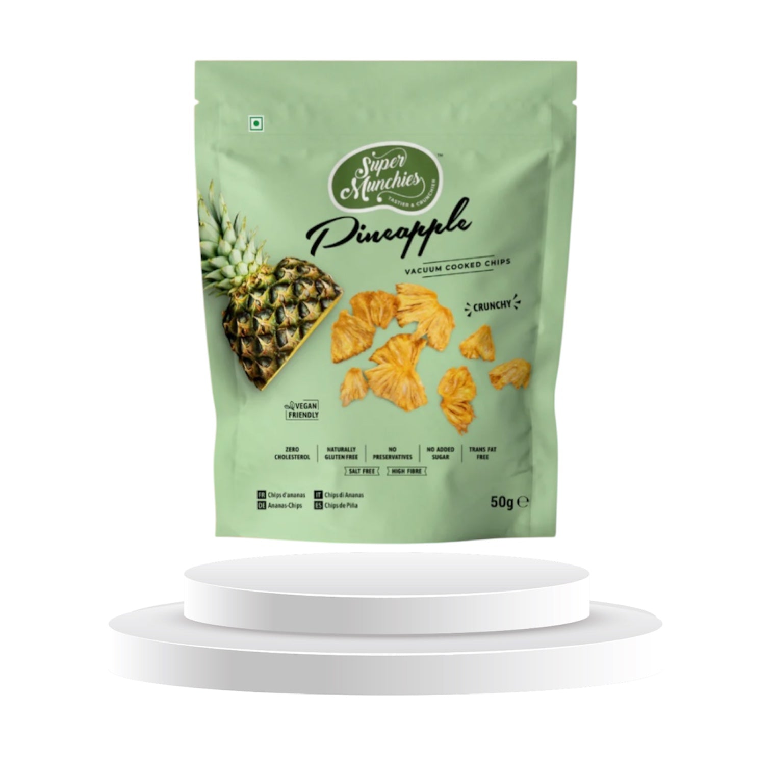 Knusprige Super Munchies Ananaschips werden aus reifen Ananas schonend vakuumgegart, um den natürlichen Fruchtgeschmack und die Süße zu bewahren. Die Chips sind vegan, glutenfrei und kommen ganz ohne Zuckerzusatz aus. Ein fruchtiger Snack mit intensivem Ananasaroma, ideal für zwischendurch oder als Topping für Bowls und Desserts.